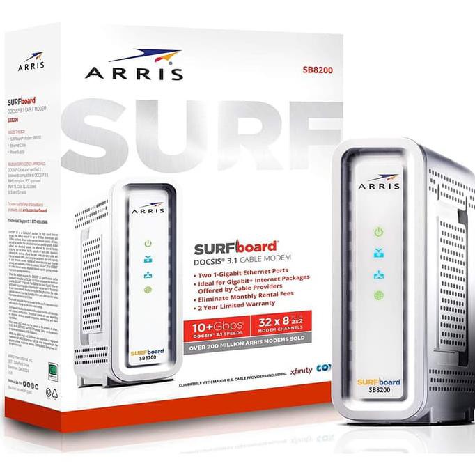 Arris surfboard cable modem. The ARRIS SURFboard SB8200 is a DOCSIS 31 modem the newest technology being offered by cable providers. It is perfect for things like 4K Ultra-HD video streaming and Virtual Reality gaming. Introducing the first Gigabit Cable Modem on the market.