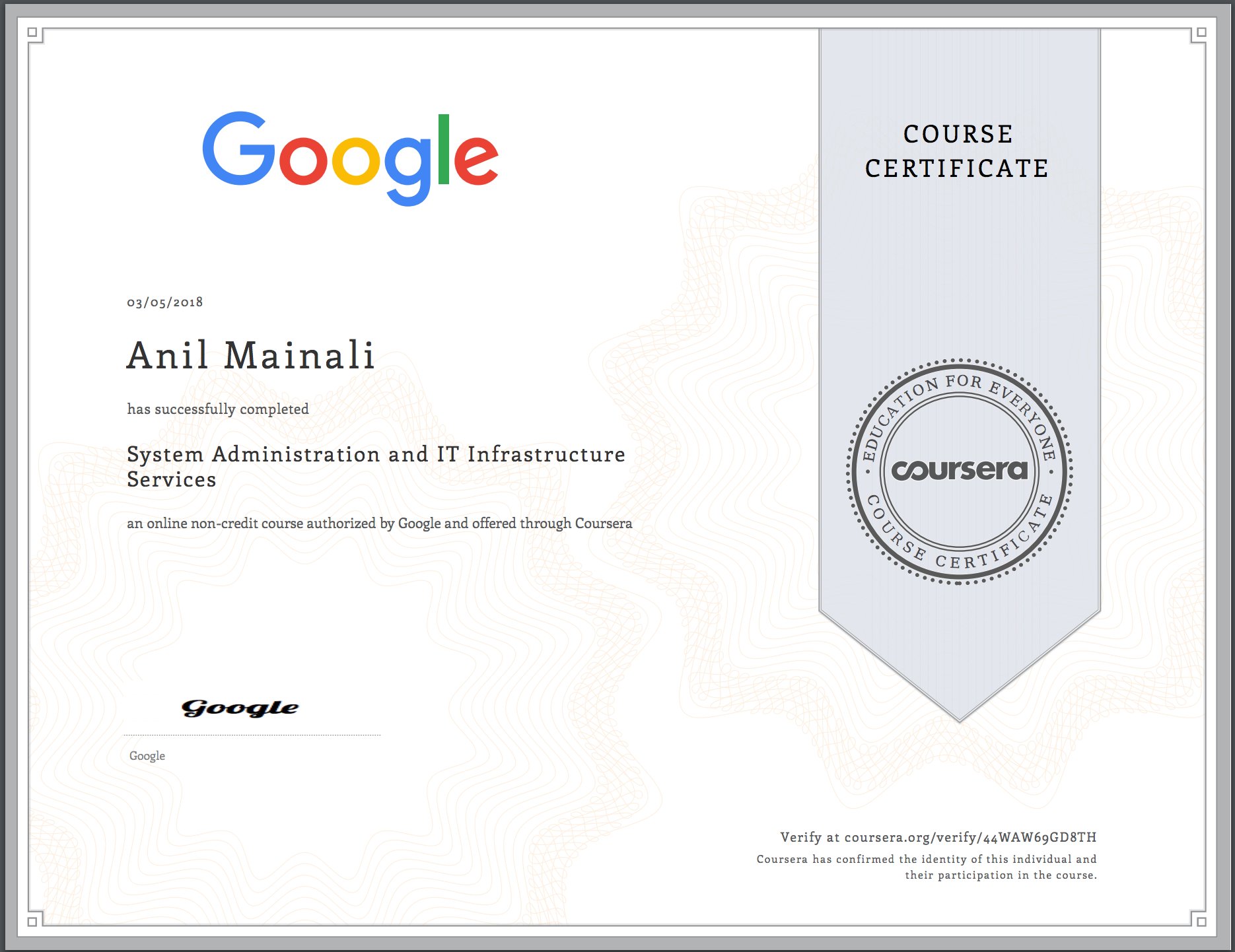 O Xrhsths Anil Mainali Sto Twitter I Am Happy To Share That I Have Completed 4 6 Google It Support Professional Certificate System Administration And It Infrastructure Services 4 Down 2 More Certificates To Complete Thank You Google